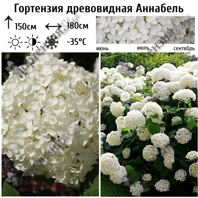 Гортензия древовидная (Hydrangea arborescens) 'Аннабель' - многолетний кустарник высотой 150 см, с округлой кроной диаметром до 180 см, с немного опушенными побегами. Белые цветки бесплодные, около 2 см, собраны в огромные симметричные шаровидные соцветия до 25 см в диаметре, изначально зеленоватые, позже становятся белыми.