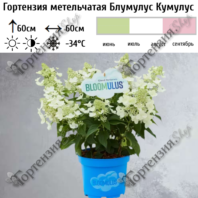 Hydrangea paniculata ‘Bloomulus Cumulus’ (Блумулус Кумулус) — воздушная классика, настоящий флагман серии, названный в честь кучевых облаков. Сорт Кумулус воздушная элегантность, словно утонченная балерина в мире гортензий. Её соцветия легкие, ажурные кружева, сотканные из изящных стерильных и большого количества фертильных цветков. Цветки в форме «блюдца», соцветия напоминают рыхлые облака. Цветки переливаются от лаймово-зеленого бутона к молочно-белому, далее раскрываются чистейшим белым в течение лета с переходом к нежнейшему кремово-розовому к концу сезона. Этот сорт подарит вашему саду ощущение простора, легкости и изысканной природной грации. Сорт создан для тех, кто устал от массивности и ищет в саду легкость и ажурность.