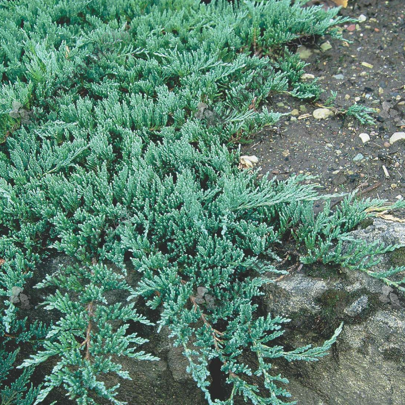 Можжевельник горизонтальный 'Glauca' Juniperus horizontalis `Glauca` - Стелющийся медленнорастущий кустарник с прижатыми к земле побегами, густо ветвится, образуя подушку высотой до 0,3 м и диаметром до 2,5 м. Хвоя мягкая, от стального до голубоватого цвета, зимой окраска не меняется.