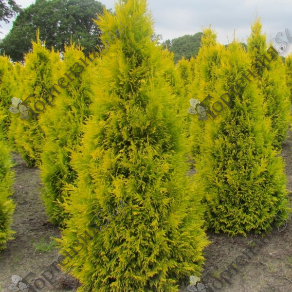 Туя западная Голден Смарагд -  это хвойное дерево с узкой конической плотной  кроной (диаметр до 1,5 м), высотой до 4-6 м, к 10-ти годам высота около 2 м. Его уникальность состоит в удивительно – красивом окрасе кроны. Ее цвет изумрудно- зеленый с золотистым отливом в течение всего года. Фома кроны коническая, правильная, сильно уплотненная. Хвоя чешуйчатая, при растирании со смолистым запахом. Предпочитает солнечные места, в тени золотистый оттенок хвои исчезает. Почва плодородная, влажная, хорошо дренированная. Зимостойка. Однако  страдают от солнечных ожогов в весенний период. Поэтому их необходимо укрывать, особенно молодые растения.