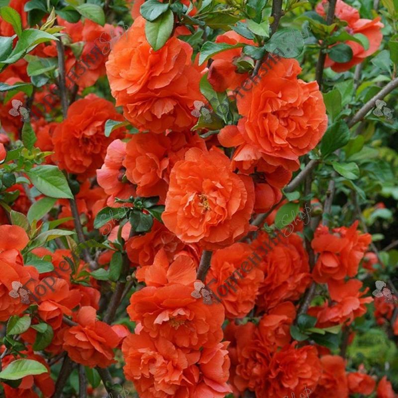Хеномелес (Chaenomeles speciosa) Оранж Шторм - раскидистый, невысокий кустарник, шиповатыми побегами и плотными блестящими темно-зелеными листьями, при распускании красноватыми, затем ярко-зелеными, а осенью багряными.Цветёт в мае в течение 20-30 дней крупными махровыми оранжево-красными цветками, которые покрывают ветки.Плодоносить начинает в трехлетнем возрасте. Плоды с ароматом ананаса плотно сидят на ветках и созревают в октябре, почти перед самыми заморозками.Высаживать лучше на солнечные, не продуваемые участки. В суровые зимы молодые побеги могут обмерзать, но при хорошем уходе быстро восстанавливаются.