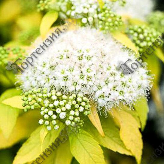 Спирея японская (Spiraea japonica `White Gold`) - Компактный карликовый кустарник, имеет раскидистую, округлую форму кроны. Как правило, растение вырастает не более 50 см высотой и 0,8 м шириной. Отличительным качеством данного растения являются яйцевидные, зубчатые, желтые листья. Осенью окраска листьев оранжево-бронзовая. В тени листья становятся зелеными. Небольшие белые цветки подобраны в щитковидные соцветия. Период цветения июнь-июль.