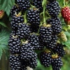 Ежевика Торнфри-  это сильнорослый куст, прямостоящий или стелящийся, не имеет шипов, стебли мощные, разрастается слабо. Высота куста 2,5-3 м. Плодоносить начинает со второй половины июля и до осени. Ягоды 4-5гр, фиолетово-черные, сочные, вкусные, нежные, сладкие с небольшой кислинкой, ароматные, ягодки водянистые не для хранения, не для транспортировки.  Они примерно одинакового размера, слабо опушенные, округло-овальной формы, прочно крепятся к короткой плодоножке. Костянки крупные. Ягоды собраны в большие кисти, по 20-30 шт. в каждой.