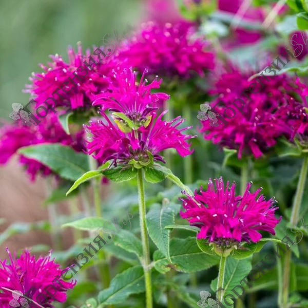 Монарда гибридная 'Грейп Гамблл' (Monarda hybrida 'Grape Gumball') корневищное многолетнее растение. Высота 60 см, листья пальчато-рассечённые, зеленые. Цветки трубчатые, пурпурные, собраны в головчатые соцветия диаметром до 6 см, располагающихся одно над другим по стеблю, цветут с июня по август. Растение привлекает бабочек и пчел. Листья имеют запах похожий на мяту и цитрус. Морозостойкость -34С. К почве не требовательна, не переносит засуху, предпочитает солнце, но прекрасно себя чувствует в легкой полутени. На солнце монарда дает хорошую зелень и отлично разрастается вширь, а в полутени дольше и ярче цветет. Используется в миксбордерах, групповых посадках, в альпийских горках, бордюрной посадке и на срезку. Монарда также известна как Бергамот. Серия SUGAR BUZZ