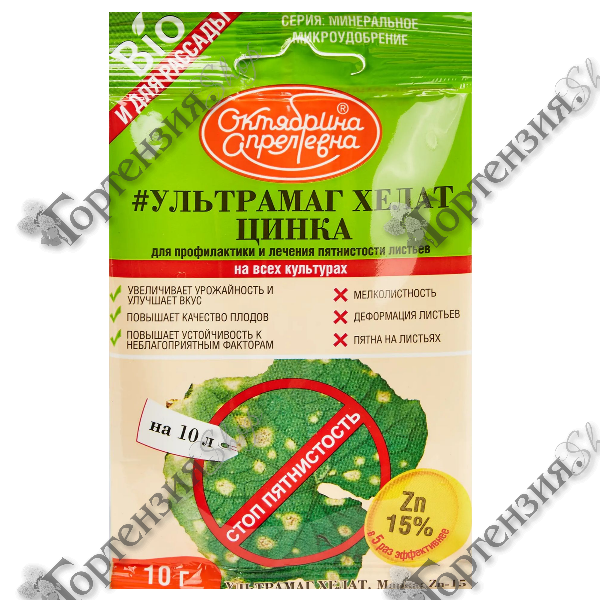 Ультрамаг Хелат цинка – концентрированное жидкое бесхлорное удобрение с высоким содержанием цинка в легкоусваиваемой растений форме. Применяется для профилактики и лечения пятнистости (хлороза) листьев всех культур. Препарат положительно влияет на процессы цветения, плодоношения, роста и развития, формирование плодов, исключает появление хлороза, повышает устойчивость к неблагоприятным факторам (смена температур, засуха), препятствует мелколистности, а также деформации и образованию пятен на листьях.