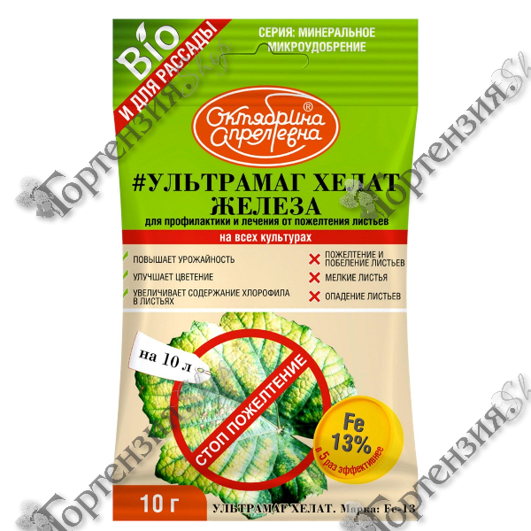 Ультрамаг с хелатом железа минеральное удобрение в легкоусваиваемой для растений форме,  улучшает цветение, увеличивает содержание хлорофилла, повышает урожайность, предотвращает пожелтение, побеление и опадение листьев. Железо участвует в образовании хлорофилла которые участвуют в фотосинтезе и дыхании растения, активирует ферменты, участвует в синтезе белков и формовании цвета фруктов.